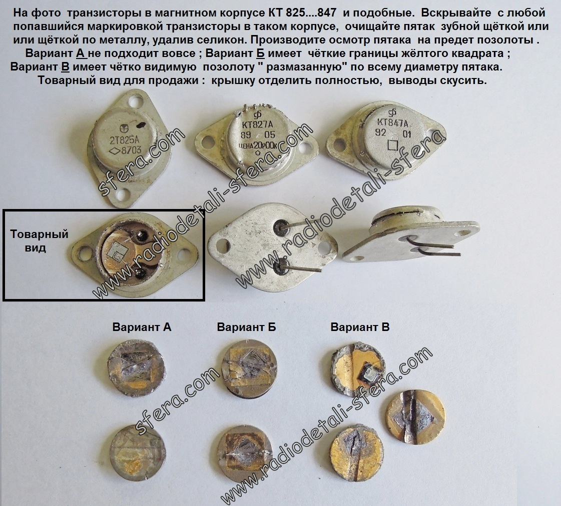 Транзисторы, в отличии от других элементов электронной техники, очень разнообразны и характеризуются большими отличиями в содержании золота и формы его нанесения. Наиболее ответственные типы транзисторов (например, высокочастотные) имеют позолоченный корпус не только внутри, но и снаружи. Остальные типы имеют позолоченные изнутри корпуса и подложки под кристаллом кремния из корунда, нержавеющей стали и стекла. Колпачки транзисторов из никеля чаще всего не содержат золота. В качестве лома драгоценных металлов транзисторы представлены двумя основными группами: